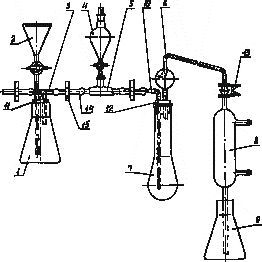 Аппарат для отгонки аммиака Предназначен для дистилляции аммиака с водяным паром, применяемым при измерении массовой доли общего азота по Кьельдалю и определении массовой доли белка в сыром, пастеризованном и стерилизованном молоке, а также кисломолочных напитках без наполнителей по методике ГОСТ 23327-98. Состоит из колбы конической 1 вместимостью 250 мл, воронки с краном 2, трубки Т-образной 3, воронки делительной 4 вместимостью 100 мл, переходника 5, каплеуловителя 6, колбы Кьельдаля 7 вместимостью 100 мл, холодильника шарикового 8, колбы приемной конической 9 вместимостью 250 мл, трубки изогнутой 10. Стеклянные детали соединяются между собой с помощью резиновых пробок 11 и 12, сферических шлифов, закрепленных зажимом 13, резиновых трубок 14 с зажимами 15. Габаритные размеры, мм — 85х620х650 |