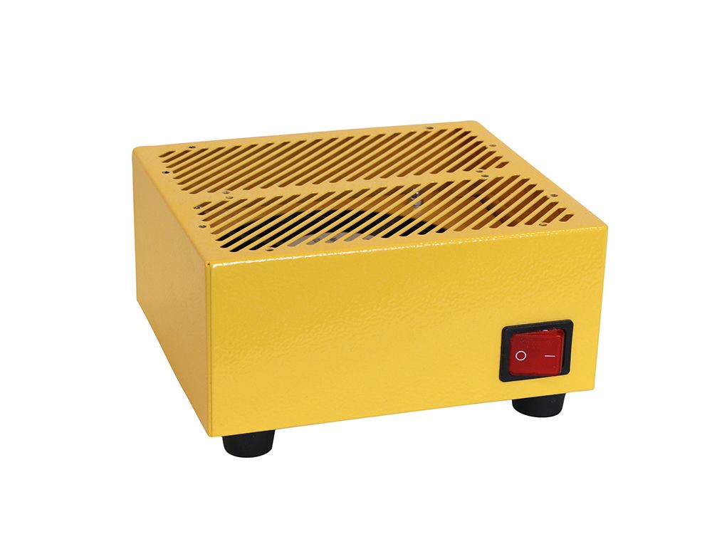 Принцип работы охладителя основан на обдуве навесок проб в сетчатых бюксах, размещенных на подставке, вращающимся на высокой скорости вентилятором.