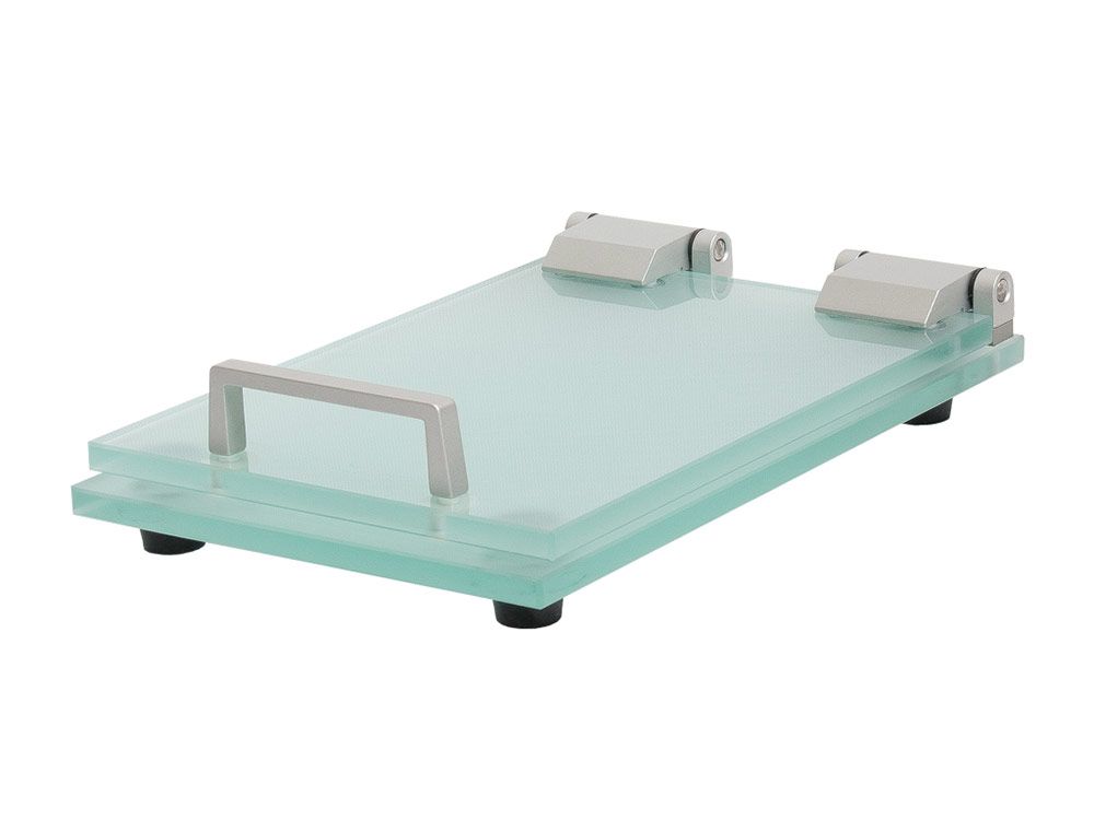 Пресс состоит из двух стеклянных пластин с шероховатой поверхностью, обеспечивает стабильный фиксированный зазор между пластинами. Имеет подставки и ручку для открывания.