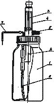 Прибор для ориентировочного дозирования жидкостей Предназначен для объемного дозирования жидкостей, в том числе агрессивных и щелочных растворов, используемых в различных областях народного хозяйства и в лабораториях. Прибор состоит из стеклянной бутыли 1 вместимостью 800 мл, в которую вставлено дозирующее устройство 2 с тефлоновым поршнем 3. На поверхности корпуса 4 дозирующего устройства нанесена ориентировочная шкала, по которой с помощью винта 5 устанавливают величину объема дозирования. Процесс дозировки осуществляется спокойным и ритмичным движением вверх и вниз поршня 3. При этом дозируемая жидкость всасывается через тефлоновую трубку 6 и выходит из прибора через сливной кончик тефлоновой трубки 7. Диапазон дозирования — от 0 до 5 мл. Шифр — 1269 |