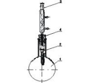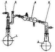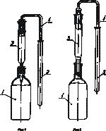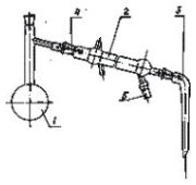 Прибор для отгонки и поглощения мышьяка в питьевой воде Предназначен для отгонки и поглощения мышьяка в соответствии с ГОСТ 4152-89. Состоит из реакционного сосуда 1 вместимостью 140-150 см3, в который помещают анализируемую пробу воды. В сосуд через резиновую пробку вставляют трубку 3, которая неплотно заполняется ватой, пропитанной уксуснокислым свинцом. Трубка 3 через соединительную трубку 4 соединяется с пробиркой 2 вместимостью 10-12 см3, заполненной раствором йода. |