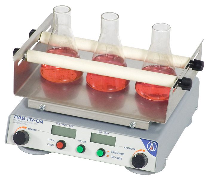 Микропроцессорный контроллер, снабженный таймером, позволяет задавать необходимые условия перемешивания любых жидких компонентов в колбах, делительных воронках, пробирках и другой лабораторной посуде.