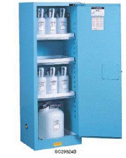Шкаф безопасности для хранения корродирующих жидкостей 892222Шкафы Justrite сделаны из прочной стали толщиной 1мм, с двойными стенками, с воздушным изолирующим зазором 38 мм. обеспечивающим огнестойкость. Шкафы имеют сварную конструкцию. Двери с высокими эксплуатационными качествами имеют самофиксирующуюся конструкцию, легко закрываются и обеспечивают максимальную защиту при возникновении опасности пожара. Безопасный и надежный механизм закрывания дверей обеспечивает их трехточечную фиксацию. Шкафы оборудованы полиэтиленовыми лотками, прикрепленными к оцинкованным полками и отдельной полиэтиленовой вставкой для нижнего поддона. Вставку можно вынуть с тем, чтобы упростить ее очистку от капель и протечек. Шкаф окрашен изнутри и снаружи эпоксидной порошковой краской., которая придает дополнительную химическую стойкость. Краска имеет эксклюзивную формулу, которая обеспечивает покрытию сопротивляемость кислотам, базовым составам и растворителям, часто используемым в лабораториях. Шкафы не рекомендуются для хранения фенола, азотной или серной кислоты. |
