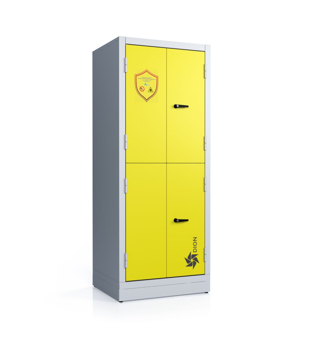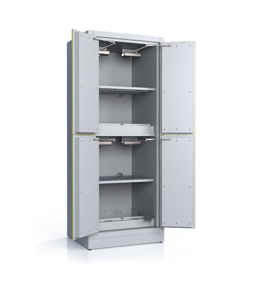 Двери шкафов для хранения ЛВЖ оборудованы механизмом автоматического самозакрытия. Система внутренней нефорсированной вентиляции для паров оснащена четерымя предохранительными клапанами с автоматическим закрытием при температуре окружающей среды 70 ± 10° C. Клапаны находятся сверху и снизу, что гарантирует возможность автоматического выхода легковоспламеняющихся веществ наружу. Внешний соединительный фланец для подключения к системе вытяжной вентиляции, диаметром 50 мм.