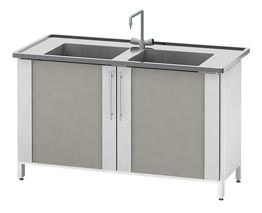 Стол-мойка ЛАБ-PRO-МД150-ССтолы-мойки ЛАБ-PRO-МО (с одинарной мойкой)илиЛАБ-PRO-МД (с двойной мойкой)могут размещаться отдельно или служить функциональным дополнением островных столов. Фасады выполнены из абсолютно влагостойких и коррозионно не активных материалов. В столах-мойках используются раковины из различных материалов. По дополнительному заказу поставляются навесные стеллажи для сушки посуды (для любых моек), опорные полипропиленовые стеллажи ЛАБ-PRO-ОСС(только для моек из полипропилена и нержавеющей стали) и брызгозащитные задние экраны ЛАБ-PRO-ЭБЗ и боковые экраны ЛАБ-PRO-ЭББ (только для моек из полипропилена и нержавеющей стали). |