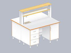 Все столы оснащены надстольными стеллажами, в которых размещаются полки и электрика. Особенности: