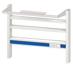 Стойка-стеллаж ЛАБ-PRO-СтПв-150Стеллаж к пристенному столу. Стеллажи к пристенным и островным столам ЛАБ-PRO-Ствыполняются из специального алюминиевого профиля, который одновременно служит кабель-каналом для подводок холодной и горячей воды, газовых трубопроводов и электрических сетей. На стеллажах укреплены полки из ПВХ с алюминиевыми бортиками безопасности,брызгозащищенные розетки и выключатели. Высокие стеллажи к пристенным столам имеют приспособления для крепления к стене. |