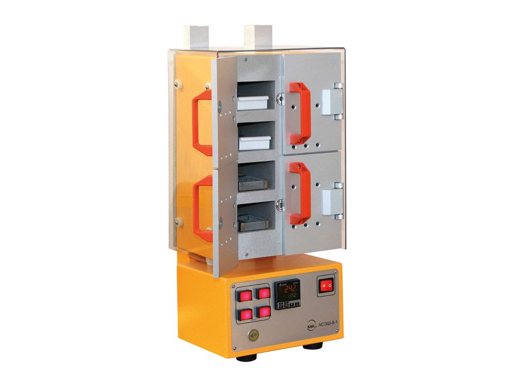 - Отсутствует необходимость прогрева сушильной камеры перед закладкой образцов выше заданной температуры высушивания. Сушильная камера представляет собой литой алюминиевый корпус, разделённый на независимые ячейки (в каждую ячейку можно поместить 2 бюксы), благодаря чему при закладке образцов температура в сушильной камере не падает.