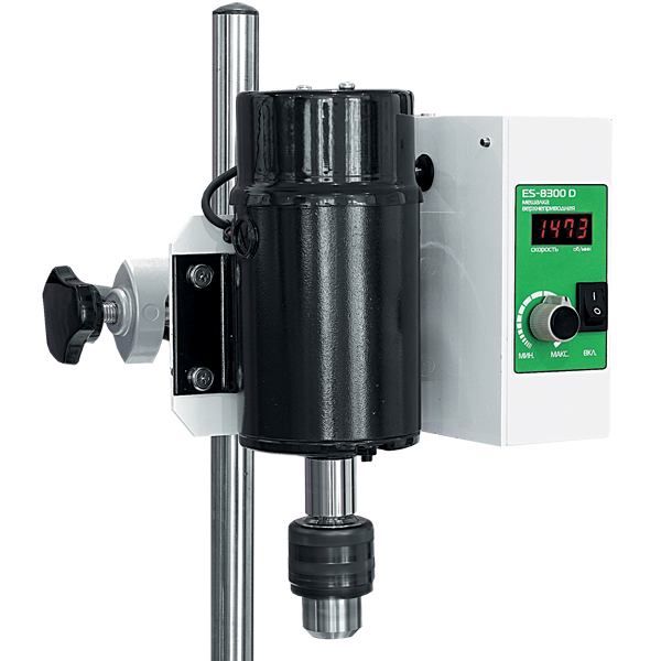 Верхнеприводная мешалка снабжена встроенным электронным бесступенчатым регулятором скорости. В комплект поставки входит только привод ES-8300 с цифровым дисплеем, отображающим число оборотов в минуту.
